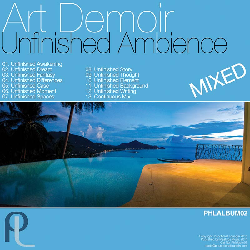 Art Demoir – Unfinished Ambience Mixed 2015 ALBUM MIX, 2015 PHL Album Mix, 2015 PHL Release, 2015 Release, AD Album Mix, Album Mixes, Art Demoir, Artist, Format, PHL Album Mix, PHL Release, PHL Releases, Release year Art Demoir Unfinished Ambience Mixed LABEL: Phunctional Loungin CAT: PHLALBUM02MIX RELEASED: 2015-10-05 Spotify Apple Music YouTube Tidal Amazon Music Deezer Pandora